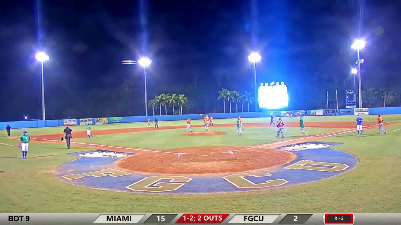T5 Perez single, Lala single, Lala picked off stealing 2nd, Morales 2 RBI double, Del Castillo walks, C. Del Castillo single, fgcu throwing error scores Morales, bases loaded 1 out, Rivera grand slam 8-0