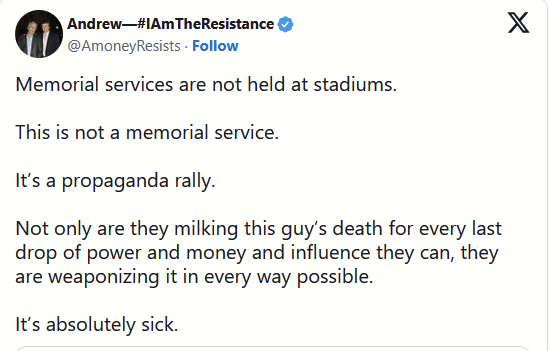 Charlie Kirk has a mom and a dad and a sister, none of which were at his funeral. Instead, only a wife with no tears showed up the the political rally they called his funeral to sell merch.