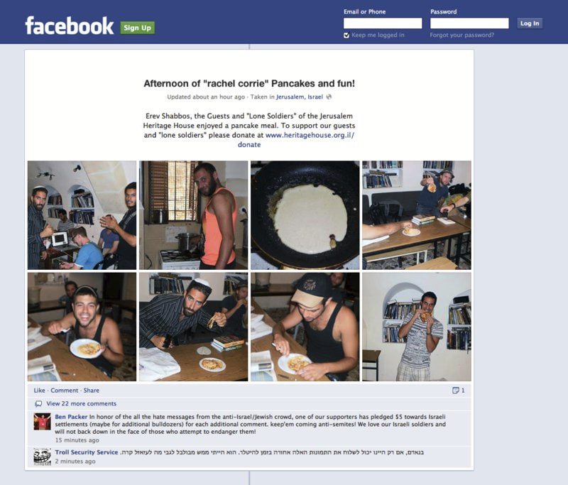 03/16 marked the anniversary of Rachel Corrie’s murder by Israel. They intentionally crushed her to death with a bulldozer for trying to stop the demolition of Palestinian homes. After they killed her, they made it a “ritual” to make pancakes with her face on it to celebrate.